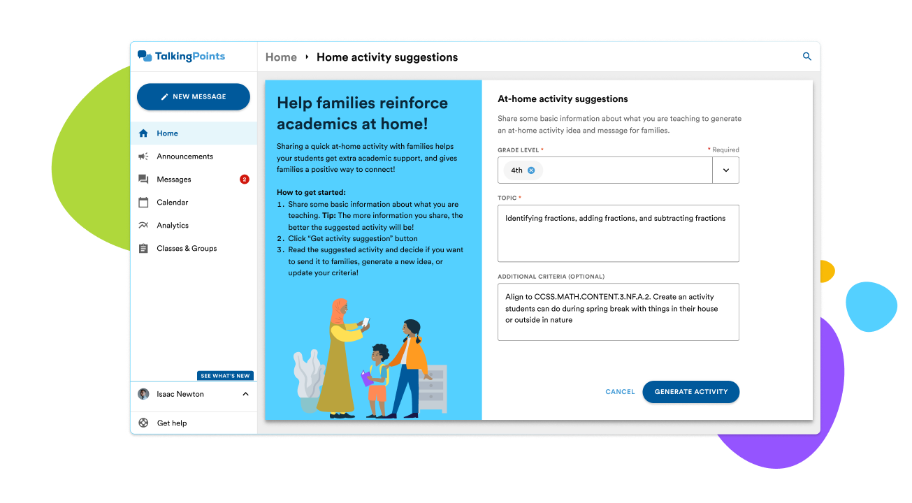 - No teacher prep required – simply select a grade level and topic (K-6), and TalkingPoints will create an easy-to-use home activity